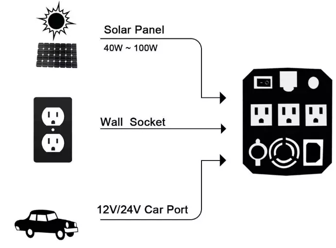 এসি / ডিসি 12 ভি / 220 ভি / 5 ভি আউটপুট হিসাবে এটি মোবাইল ফোন, ট্যাবলেট, ল্যাপটপ, ছোট প্রিন্টার, ধরণের ল্যাম্প এবং লণ্ঠন, ছোট ফিশ ট্যাঙ্ক হিটার, ফটোগ্রাফিক সরঞ্জাম,