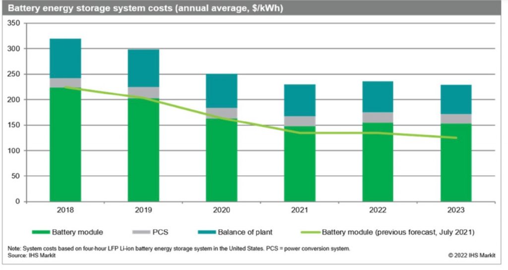সাম্প্রতিক একটি শ্বেতপত্রে, IHS Markit ভবিষ্যদ্বাণী করেছে যে কাঁচামালের ক্রমবর্ধমান দাম 2024 সাল পর্যন্ত EV ব্যাটারির দাম আরও কমবে৷ সেই বিশ্লেষণটি ভবিষ্যদ্বাণী করেছে যে গড় 2022 EV ব্যাটারির দাম 2021 সালের তুলনায় 5% বেশি হবে, বেশিরভাগই স্বয়ংক্রিয়ভাবে বৃদ্ধির কারণে৷ লিথিয়াম আয়রন ফসফেট (LFP) ব্যাটারির জন্য শিল্পের চাহিদা।