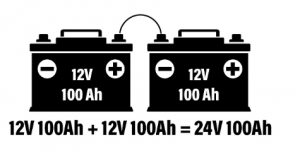 নীচের চিত্রে, দুটি আছে 12 ভি ব্যাটারি সিরিজে সংযুক্ত যা এই ব্যাটারি ব্যাংককে 24V সিস্টেমে পরিণত করে। আপনি আরও দেখতে পাচ্ছেন যে ব্যাংকের এখনও মোট ক্ষমতার রেটিং 100 আহ।